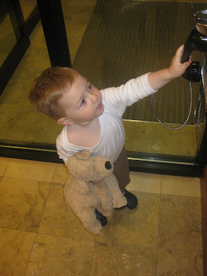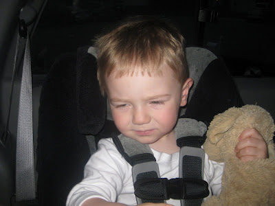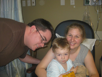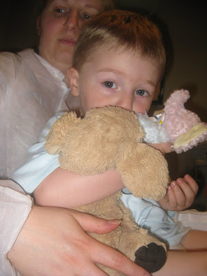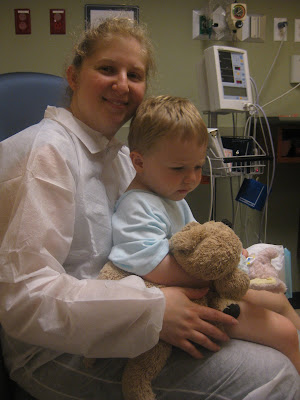 We are happy to report that JT's surgery this morning went off with out a hitch. The little guy was grumpy all morning as he was woken early and then not allowed to eat. The wait for the actual surgery eas made even worse when JT got hit with an automatic door, which left quite a bruise on his left temple.